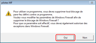 Si la boîte de dialogue suivante s'affiche pendant l'installation, sélectionnez [Oui]. Le blocage par le Pare-feu Windows est alors désactivé et vous pouvez procéder à l'installation.