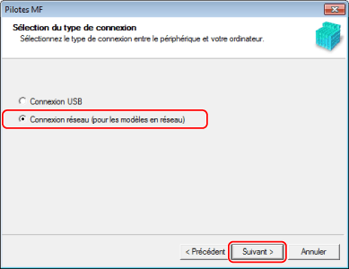 Si l'écran suivant s'affiche, sélectionnez [Connexion réseau (pour les modèles en réseau)] → cliquez sur [Suivant].