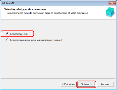 Si l'écran suivant s'affiche, sélectionnez [Connexion USB] → cliquez sur [Suivant].