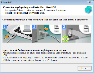 Si l'écran suivant s'affiche, éteignez le périphérique puis reconnectez le câble USB et rallumez le périphérique.
