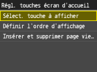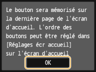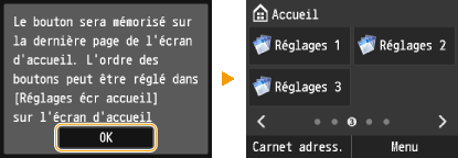 Si l'écran d'accueil est saturé et qu'il n'est plus possible d'enregistrer des paramètres, supprimez des espaces avec <Réglages écr accueil> sur l'écran d'accueil ou supprimez des boutons enregistrés. Suppression de boutons