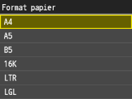 Si l'écran illustré ci-dessus ne s'affiche pas lorsque le papier est chargéSi vous chargez toujours le même papier dans le plateau multifonctions, vous pouvez ignorer les opérations des réglages papier en enregistrant le format et le type de papier comme réglages par défaut. Notez que si un réglage par défaut est mémorisé, l'écran illustré ci-dessus ne s'affiche pas. Pour afficher l'écran, sélectionnez <Désactivé> pour <Enregistrer réglages par défaut> (Enregistrement des réglages papier par défaut pour l'utilisation du plateau multifonctions).