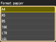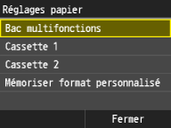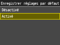Une fois que les réglages par défaut concernant le papier sont enregistrés, l'écran de définition du papier ne s’affiche plus lorsque vous insérez du papier ; les mêmes réglages sont appliqués. Si vous utilisez un autre format ou un autre type de papier sans corriger les réglages papier, l'appareil n'imprimera pas le document correctement. Pour éviter ce problème, désactivez alors les réglages par défaut en sélectionnant <Désactivé> à l'étape 3 et chargez ensuite le papier.