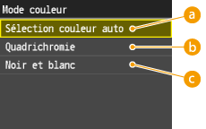 Cette machine est fournie avec le mode <Sélection couleur auto> qui reconnaît si un original est en couleur ou en noir et blanc, et qui commute automatiquement en mode Quadrichromie et Noir. Vous pouvez commuter manuellement entre les modes <Quadrichromie> et <Noir et blanc> chaque fois que nécessaire.