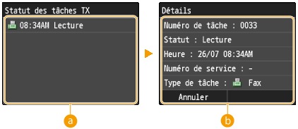 ![]() <Statut des tâches TX>/<Statut des tâches RX>Affiche la liste des documents envoyés et reçus ou en attente de traitement.