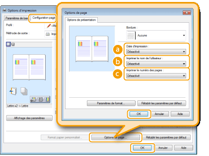 Onglet [Configuration page] Cliquez sur [Options de page] Sélectionnez l'emplacement de la date d'impression, du nom d'utilisateur ou du numéro des pages [OK]  [OK]
