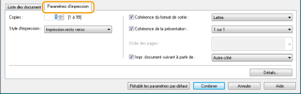 Cliquez sur l'onglet [Paramètres d'impression] pour afficher l'écran destiné à définir la configuration de l'impression telle que le nombre de copies et l'impression recto/recto verso. Les réglages spécifiés à ce stade concernent l'intégralité de la tâche d'impression.
