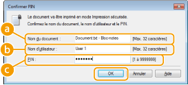 Vérifiez le nom du document, le nom d'utilisateur et le code PIN, puis cliquez sur [OK].