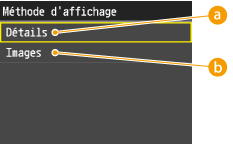 Vous pouvez remplacer le mode d'affichage défini sur <Détails> (pour les noms de fichiers et les dates de modification) par le mode <Images> (pour les aperçus). La prévisualisation des images permet d'examiner le contenu du fichier avant de sélectionner le fichier à imprimer.