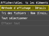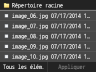 Lorsque vous tapez sur <Date/Heure (Croissant)> ou <Date/Heure (Décroissant)>, le classement des fichiers s'effectue selon la date et de l'heure de modification des fichiers.