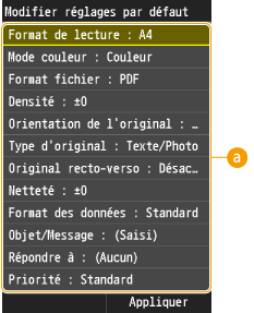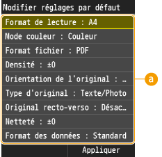 Sélectionnez le réglage à personnaliser en modifiant sa valeur par défaut.