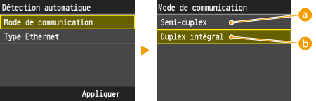 <Semi-duplex> ou <Duplex intégral>.![]() <Semi-duplex>Reçoit et envoie les données de communication en alternance. Sélectionnez cette option si l'appareil est relié à un périphérique de réseau en semi-duplex.