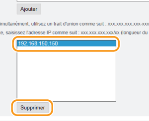 Suppression d'une adresse IP des exceptions Sélectionnez une adresse IP et cliquez sur [Supprimer].
