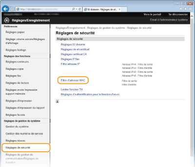 ![]() Vérification des erreurs de saisie En cas de saisie incorrecte des adresses MAC, vous risquez de ne pas pouvoir accéder à l'appareil via l'interface utilisateur distante. Si cela devait se produire, il faudrait régler <Filtre d'adresse MAC> sur <Désactivé>. Filtre d'adresse MAC