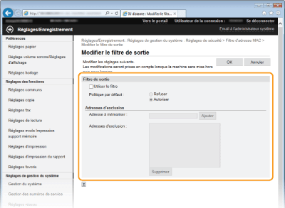 ![]() En cas de sélection de la case d'option [Refuser] pour un filtre de sortie Les paquets de multidiffusion et de diffusion de sortie ne peuvent pas être filtrés. Suppression d'une adresse MAC des exceptions