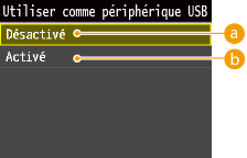 Vous avez la possibilité de désactiver le port USB situé à l'arrière de l'appareil. Dans ce cas, l'appareil ne sera plus capable de communiquer avec un ordinateur via une connexion USB. Ce réglage n'a aucun effet sur le port USB en face avant, car celui-ci sert uniquement à rattacher des périphériques mémoire USB.