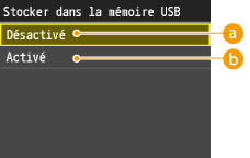 Interdit le stockage des documents numérisés sur un périphérique mémoire USB. Les données numérisées ne peuvent pas être placées sur un périphérique mémoire USB.