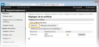 Il est possible de générer une paire de clés sur l'appareil lorsqu'elle est nécessaire à une communication cryptée via TLS (Transport Layer Security). Vous pouvez faire appel à TLS lors de l'accès à l'appareil depuis l'interface utilisateur distante. Vous pouvez enregistrer jusqu'à cinq paires de clés sur l'appareil.
