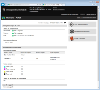 Vous pouvez vérifier l'état des documents ou de l'appareil et modifier certains réglages. Si vous désirez supprimer les documents imprimés, renseignez le nom de l'utilisateur associé aux documents dans [Nom d'utilisateur]. Le nom d'utilisateur est automatiquement défini pour les documents imprimés selon les informations telles que le nom de l'ordinateur ou le nom de connexion à l'ordinateur.