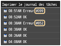Si l'impression échoue ou si vous ne parvenez pas à envoyer ou à recevoir un fax ou encore à lire un document numérisé ou si toute autre erreur se produit, cette erreur s'affiche au sein d'un rapport ou d'un message dans l'écran <Suivi statut> sous forme d'un nombre à trois chiffres (le code d'erreur). Examinez les sections suivantes pour trouver la cause possible et la solution de chaque code d'erreur. Pour savoir comment imprimer un rapport d'erreur et les informations incluses dans le rapport, reportez-vous à la section