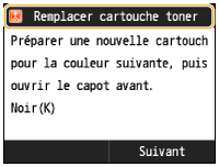 La couleur du toner à remplacer s'affiche à l'écran. Si plusieurs cartouches doivent être remplacées, remplacez les cartouches dans l'ordre suivant : noir, jaune, magenta, cyan.