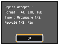 Contrôlez que le format et le type du papier mentionnés à l'écran correspondent au papier chargé dans l'appareil et tapez sur <OK>.