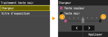 Si les résultats de la copie ou le texte noir ne sont pas satisfaisants, ce réglage peut améliorer la reproduction des couleurs. Vous pouvez définir une valeur différente pour les documents insérés dans le chargeur et pour ceux placés sur la vitre d'exposition.