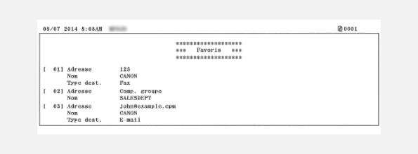 Vous vérifiez la liste des destinataires mémorisés dans le carnet d'adresses à l'aide des options <Composition codée>, <Favoris> et <Comp. groupe> en imprimant la liste du carnet d'adresses.