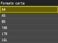 Se non viene visualizzata la schermata precedente quando si carica la cartaSe si carica sempre la stessa carta nel vassoio multiuso, è possibile ignorare le operazioni di impostazione carta registrando formato e tipo di carta come impostazioni predefinite. Quando si registra l'impostazione predefinita, tuttavia, la schermata illustrata sopra non viene visualizzata. Per visualizzare la schermata, selezionare <Off> per <Registraz. impost. predefinite> (Registrazione delle impostazioni carta predefinite per il vassoio multiuso).