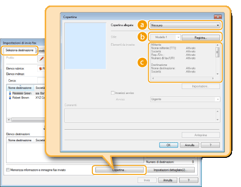 È possibile aggiungere una copertina al documento da inviare. Selezionare una copertina dalle tre copertine predefinite nel driver fax, oppure creare copertine personalizzate. Per ulteriori informazioni, fare clic su [?] nella schermata del driver fax.