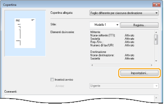 Visualizza gli elementi da includere in una copertina. Per cambiare gli elementi da includere, fare clic su [Impostazioni].