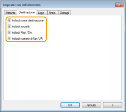 Selezionare gli elementi della destinazione da includere e specificare le informazioni. Nomi di destinazione, nomi di aziende, nomi di divisioni e numeri di fax specificati nella scheda [Seleziona destinazione]/[Immetti destinazione] (
