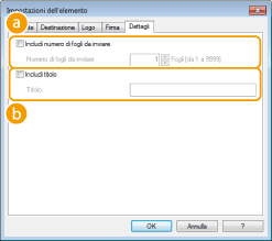Selezionare questa casella di controllo se si desidera includere il numero di fogli da inviare nella copertina e specificare il numero di fogli in [Numero di fogli da inviare]. Il numero di fogli da inviare non viene conteggiato automaticamente. Il valore specificato qui è incluso nella copertina.