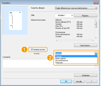 Sono disponibili avvisi come "Urgente" e "Riservato." È inoltre possibile immettere i caratteri direttamente in [Avviso] invece di selezionare un avviso dall'elenco.