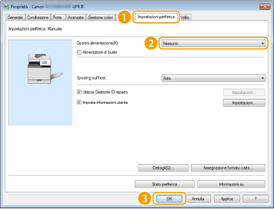 Stampa con PCL (imageRUNNER C1225iF)È possibile utilizzare il driver della stampante PCL5c, PCL6 e PS oltre al driver UFR II. Le impostazioni di stampa disponibili variano in base al driver della stampante. Per ulteriori informazioni, fare clic su [?] in ciascuna schermata del driver della stampante.