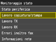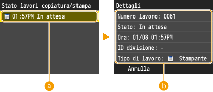 ![]() <Registro lavori stampa>Visualizza un elenco di documenti stampati. <OK> viene visualizzato in caso di corretta stampa di un documento, mentre <Errore> viene visualizzato quando non è stato possibile stampare un documento a seguito di annullamento o a causa di un errore.