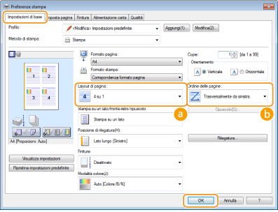 È possibile stampare più pagine su un singolo foglio. Ad esempio, è possibile stampare da quattro a nove pagine su un foglio con l'opzione [4 su 1] o [9 su 1]. Utilizzare questa funzione per risparmiare carta o visualizzare il documento come miniatura.