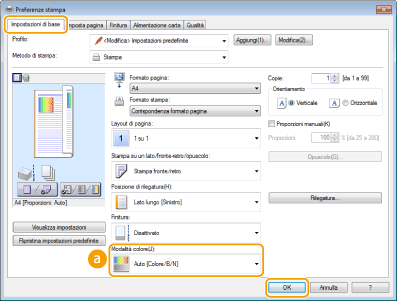È possibile selezionare un modo colore (colori o bianco e nero). Se un documento contiene pagine a colori e in bianco e nero, specificando la modalità automatica, le pagine a colori vengono stampate a colori e le pagine in bianco e nero stampate automaticamente in bianco e nero.
