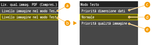 <PDF (Compresso)> comprime foto e illustrazioni di documenti maggiormente rispetto a <PDF>. Le dimensioni del file saranno minori, ma la qualità delle immagini di alcuni documenti o il numero di documenti digitalizzabili contemporaneamente potrebbe essere minore. Se si seleziona <PDF (Compresso)>, è possibile specificare il livello di compressione.