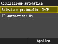 ![]() ![]() Se non si desidera utilizzare DHCP per assegnare un indirizzo IP Selezionare <Off>. Se si seleziona <DHCP> quando questo servizio non è disponibile, la macchina sprecherà tempo e risorse di comunicazione nella ricerca di questi servizi nella rete. |