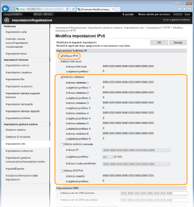 Gli indirizzi IPv6 della macchina possono essere configurati attraverso la IU remota. Prima di impostare indirizzi IPv6, verificare le impostazioni dell'indirizzo IPv4 (Visualizzazione delle impostazioni IPv4). È necessario impostare correttamente i parametri IPv4 per utilizzare gli indirizzi IPv6. Tenere presente che la funzione di scansione che utilizza il driver dello scanner non è disponibile in ambiente IPv6. La macchina può utilizzare fino a nove dei seguenti indirizzi IPv6: