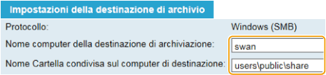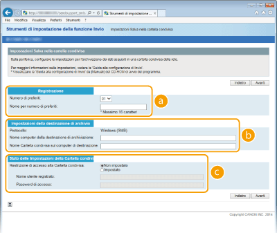 Configurazione SMB). Per configurare la macchina per salvare i documenti digitalizzati in una cartella condivisa in rete tramite SMB, specificare la posizione della cartella condivisa da un computer mediante Strumenti di impostazione della funzione Invio.