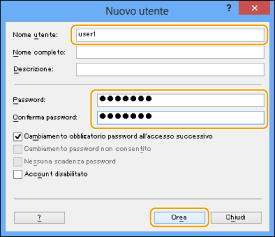 immettere la password in [Password] immettere nuovamente la password in [Conferma password] fare clic su [Crea].![]() Impostare un nome utente di massimo 20 caratteri alfanumerici e una password di massimo 32 caratteri alfanumerici.