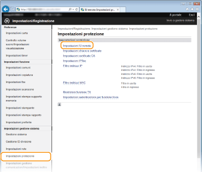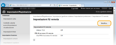<Impostazioni gestione sistema> <Impostazioni IU remota> <Impostazioni protezione accesso IU remota> <On> Immettere il PIN Applica Immettere il PIN (Conferma) Applica.Se le impostazioni dell'IU remota sono inizializzateViene inizializzato anche il PIN di accesso all'IU remota. Dopo l'inizializzazione, reimpostare il PIN. Inizializzazione del menu