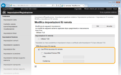 Se il PIN viene dimenticatoImpostare un nuovo PIN di accesso alla IU remota nel menu di impostazione sul pannello operativo. Eseguire l'operazione seguente sulla macchina: <Menu>