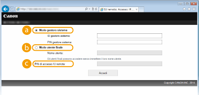 È possibile eseguire tutte le operazioni e impostazioni della IU remota. Immettere l'ID appropriato in [ID gestore sistema] e il PIN in [PIN gestore sistema] (