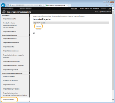 È possibile salvare i dati di impostazione delle opzioni di menu sul computer, oppure registrare i dati salvati nella macchina. I dati esportati possono essere importati. Se si utilizza lo stesso modello, altre macchine possono importare i dati esportati da questa macchina e viceversa. È possibile eseguire queste operazioni solo dopo aver effettuato l'accesso in modalità Gestore sistema.