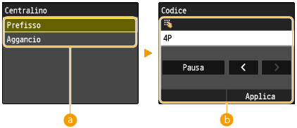 Immettere il prefisso utilizzando i tasti numerici, toccare <Pausa>, quindi toccare <Applica>. Se non si inserisce una pausa, il prefisso non viene registrato.
