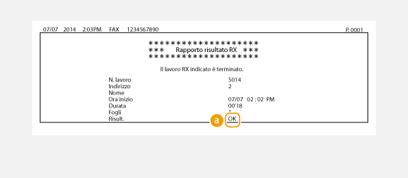 "OK" indica che la trasmissione è stata correttamente completata mentre "NG" con tre cifre (un codice di errore) indica che la trasmissione non è riuscita (