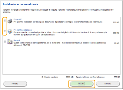Deselezionare tutte le caselle di controllo tranne [Manuali], quindi fare clic su [Installa].